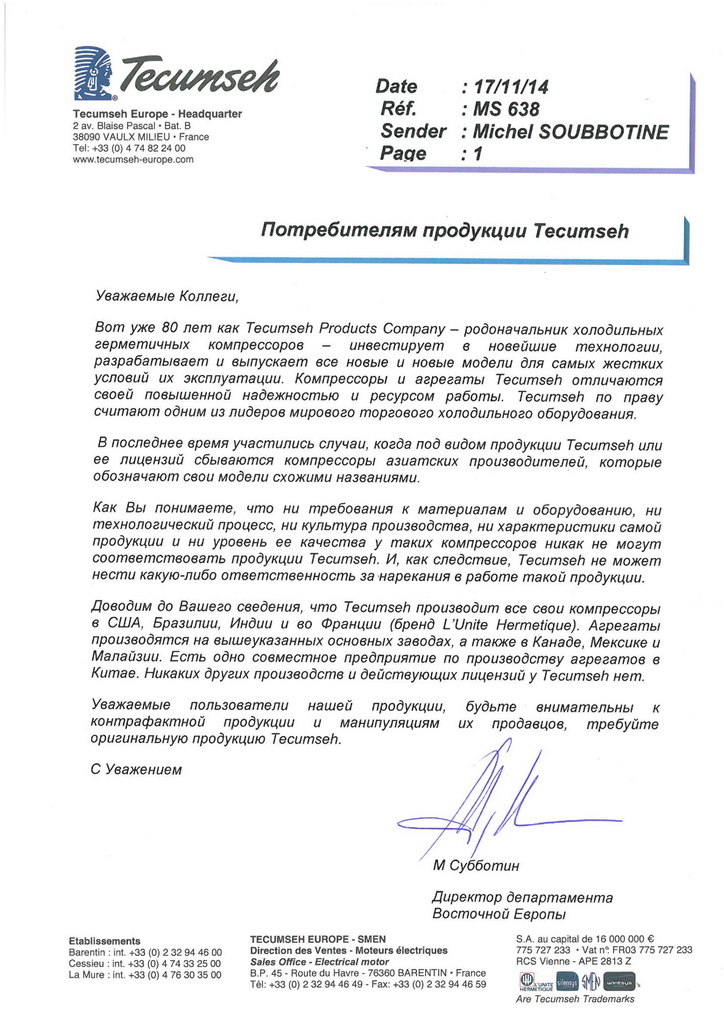 Единственным официальным дистрибьютором и сервисным партнером Tecumseh Products Company на территории РБ является УП «Анеромхолод». Однако мы не несем ответственности за качество контрафактной продукции и негативные последствия, возникшие в результате ее применения.